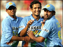 लेकिन उन्हें उम्मीद से ज़्यादा सफलता मिली और पहले ही ओवर में इरफ़ान पठान ने सनत जयसूर्या को चलता करके भारत को शानदार शुरुआत दी. जयसूर्या अपना खाता भी नहीं खोल पाए. इसके बाद तो एक के बाद एक श्रीलंका के विकेट गिरते रहे. कप्तान मर्वन अटापट्टू चार रन पर और जयवर्धने सात रन बनाकर आउट हो गए. सर्वाधिक रन बनाने वाले संगकारा का विकेट गिरने के बाद तो स्थिति और ख़राब हो गई. लेकिन रसेल अर्नाल्ड और फ़रवीज़ महारूफ़ ने स्कोर को 100 के पार पहुँचाने में मदद की. अर्नाल्ड ने 15 और महारुफ़ ने 18 रन बनाए. आख़िर में उपुल चंडाना ने भी 19 रन टीम के लिए जोड़े. इस तरह श्रीलंका की पूरी टीम 35.4 ओवर में सिर्फ़ 122 रन बनाकर आउट हो गई. भारत की ओर से सबसे ज़्यादा विकेट लिए इरफ़ान पठान ने. उन्होंने 37 रन देकर चार विकेट चटकाए. जेपी यादव और हरभजन सिंह को दो-दो विकेट मिले. एक विकेट अजित अगरकर को मिला. | इससे जुड़ी ख़बरें गांगुली की वापसी पर फ़ैसला आज28 अक्तूबर, 2005 | खेल भारत के हाथों पिटा श्रीलंका25 अक्तूबर, 2005 | खेल 'कमज़ोर टीमों की मदद करना चाहता हूँ'24 अक्तूबर, 2005 | खेल सिरीज़ है 'नाक की लड़ाई'24 अक्तूबर, 2005 | खेल वॉर्न को पोंटिंग की नसीहत23 अक्तूबर, 2005 | खेल युवाओं को मौक़ा देने की वकालत22 अक्तूबर, 2005 | खेल क्रिकेट मैच प्रसारण के लिए नया आदेश21 अक्तूबर, 2005 | खेल प्रसार भारती को प्रसारण अधिकार20 अक्तूबर, 2005 | खेल इंटरनेट लिंक्स बीबीसी बाहरी वेबसाइट की विषय सामग्री के लिए ज़िम्मेदार नहीं है. | |||||||||||||||||||||||||||||||||||||||||||||||||||||||||||||||||||||||||||||||||||||||||||||