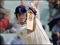 इंग्लैंड पहली पारी- 400 रन/ दूसरी पारी- 191 रन भारत पहली पारी- 279 रन/ मुंबई टेस्ट में जीत के लिए ज़रूरी 313 रनों के लक्ष्य का पीछा करती भारतीय टीम ने चौथे दिन के खेल की समाप्ति तक एक विकेट पर 18 रन बना लिए थे. आउट होने वाले बल्लेबाज़ इरफ़ान पठान थे. एंडरसन ने उन्हें 6 रन के व्यक्तिगत स्कोर पर बोल्ड कर दिया. वसीम जाफ़र 4 और अनिल कुंबले 8 रन बना कर नाबाद हैं. इससे पहले इंग्लैंड की दूसरी पारी 191 रनों पर सिमट गई है. इस तरह जीत के लिए भारत के सामने है 313 रनों का लक्ष्य. इंग्लैंड की दूसरी पारी में कप्तान एंड्रयू फ़्लिंटॉफ़ ने सर्वाधिक 50 रन बनाए. चौथे दिन के खेल के पहले सत्र में बढ़िया कर खेल रहे ओवैस शाह अंतत: रन आउट होकर पैवेलियन लौटे. शाह ने 38 रन बनाए. उनके आउट होने के बाद कॉलिंगवुड का साथ देने आए कप्तान फ़्लिंटॉफ़. दोनों के बीच 66 रनों की महत्वपूर्ण साझेदारी हुई. कॉलिनवुड को हरभजन ने अपनी ही गेंद पर एक मुश्किल कैच लेकर आउट किया. जोन्स के रूप में अगला विकेट भी हरभजन को ही मिला. जोन्स ने मात्र तीन रन बनाए. फ्लिंटॉफ़ आउट होने वाले नौवें खिलाड़ी थे. उनको कुंबले की गेंद पर विकेटकीपर धोनी ने स्टंप्ड आउट किया.