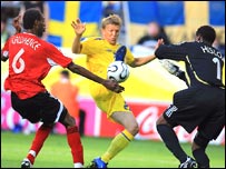 अपने पहले विश्व कप के पहले मैच में त्रिनिदाद एंड टोबैगो ने स्वीडन जैसी मज़बूत टीम को कोई गोल नहीं करने दिया और मैच ड्रॉ ख़त्म हुआ. त्रिनिदाद एंड टोबैगो ने दूसरा हाफ़ 10 खिलाड़ियों के बलबूते ही खेला. क्योंकि एवरी जॉन को इस विश्व कप का पहला रेड कार्ड दिखाकर मैदान से बाहर कर दिया गया. त्रिनिदाद एंड टोबैगो की ओर से गोल करने का सबसे अच्छा मौक़ा मिला कॉर्नेल ग्लेन को लेकिन गेंद गोलपोस्ट से टकरा गई. हैरानी की बात ये रही कि इस मैच में स्वीडन के पास ही ज़्यादा समय गेंद रही और त्रिनिदाद एंड टोबैगो के खिलाड़ी गोल बचाने की कोशिश में ही लगे रहे, फिर भी स्वीडन एक गोल तक नहीं मार पाया. फ़्रेडी ल्यूमबर्ग, हेनरिक लॉरसन और इब्राहिमोविच जैसे खिलाड़ियों से सजी स्वीडन की टीम पहले हाफ़ में पूरे नियंत्रण में थी. ज़्यादातर गेंद उनके पास ही रही. लेकिन गोल करने में वे लगातार नाकाम रहे. हताशा दूसरे हाफ़ में भी कमोबेश यही स्थिति रही और स्वीडन के खिलाड़ी लगातार इस कोशिश में लगे रहे कि किसी तरह वे गोल करे. आक्रमण पंक्ति में फ़्रेडी ल्यूमबर्ग, इब्राहिमोविच, विल्हेमसन, स्वेनसन ने कई ख़ूबसूरत मूव बनाए. लेकिन या तो गोलकीपर को वे छका नहीं पाए या फिर निशाना चूक गया. आख़िरी क्षणों में तो स्वीडन की हताशा देखने लायक़ थी. एक गोल करने के लिए हताश-परेशान स्वीडन के खिलाड़ी पसीने-पसीने होते रहे. लेकिन नतीजा शून्य रहा.