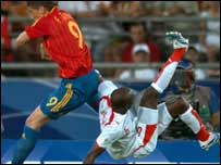 सोमवार को हुए फ़ुटबॉल मुकाबलों में से सबसे दिलचस्प मैच में स्पेन ने ट्यूनीशिया को 3-1 से हरा दिया. मैच के पहले हाफ़ में 1-0 से पिछड़ने के बाद स्पेन ने ज़बरदस्त वापसी की और ट्यूनीशिया के ख़िलाफ़ 3-1 से जीत दर्ज की. इसके साथ ही स्पेन ने आख़िरी 16 में भी जगह पक्की कर ली. स्पेन के लिए फ़र्नांडो टोर्रेस ने दो गोल किए जबकि रॉल ने एक गोल किया. ट्यूनीशिया के लिए जौहर मनारी ने गोल दागा. स्पेन को मिला शुरूआती झटका मैच शुरू होने के आठ मिनट बाद ही ट्यूनीशिया ने सबको हैरत में डालते हुए स्पेन के ख़िलाफ़ गोल कर दिया. गोल जौहर मनारी ने किया. हालांकि इसके लिए उन्हें ज़ायद जाज़ीरी का शुक्रिया अदा करने चाहिए जिन्होंने पेनल्टी क्षेत्र में अच्छा खेला और इसके बाद गेंद मनारी के पास चली गई. जब मनारी ने शॉट लगाया तो पहली बार स्पेन के गोलकीपर ने गोल बचा लिया लेकिन मनारी ने दोबारा शॉट लगाकर गोल कर दिया. पहले हाफ़ में गेंद ज़्यादातर समय स्पेन के पास ही रही लेकिन इसके बावजूद पहले हाफ़ में स्पेन कोई गोल नहीं कर सका. खेल के दौरान हुई बारिश ने स्पेन की मुश्किलें और बढ़ा दीं. फ़र्नांडो का कमाल