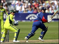बेल का विकेट शोएब ने लिया जबकि पीटरसन और स्ट्रॉस को मोहम्मद आसिफ़ ने पवेलियन का रास्ता दिखाया. बाद में डैलरिम्पल और यार्डी के महत्वपूर्ण रनों की बदौलत इंग्लैंड 20 ओवर में 144 रन बनाए. हालाँकि सबसे ज़्यादा 53 रन बनाए ट्रेस्कोथिक ने. डैलरिम्पल ने 27 और यार्डी ने 24 रन बनाए. सबसे ज़्यादा तीन विकेट मिले अब्दुल रज़्ज़ाक़ को जबकि मोहम्मद आसिफ़ के खाते में आए दो विकेट. लंबे समय बाद मैच खेल रहे शोएब को एक विकेट से संतोष करना पड़ा.