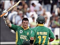 इस समय ऐसा लग रहा था कि दक्षिण अफ़्रीका एक बार फिर बड़े स्कोर का पीछा करने में अपना ही इतिहास दोहराने जा रही है. लेकिन तभी डीविलियर्स वाटसन के थ्रो पर रनआउट हो गए. उन्होंने 70 गेंदों पर 92 रन बनाए. इसके बाद टीम के कुल योग में 24 रन ही जुटे थे कि ज़बर्दस्त फॉर्म में दिख रहे कप्तान ग्रेम स्मिथ रिटायर्ड हर्ट हो गए. यहीं से दक्षिण अफ़्रीकी पारी लड़खड़ा गई. गिब्स 47 रन बना कर ब्रैड हॉग के शिकार बने और इसके बाद एश्वेल प्रिंस भी एक रन बना कर पैवेलियन लौट गए. मार्क बाउचर ने तेज़ी से रन जुटाना शुरू किया लेकिन वो टिक नहीं पाए और 22 रन बना कर टाइट की गेंद पर बोल्ड हो गए. इसके बाद जस्टिन केंप को भी टाइट ने एक रन के निजी स्कोर पर वापस भेज दिया. तब मैदान पर फिर उतरे ग्रेम स्मिथ धैर्य खो चुके थे और तेज़ी से रनरेट बढ़ाने के चक्कर में 74 के निजी स्कोर पर आउट हो गए. ऑस्ट्रेलिया की ओर से ब्रैड हॉग ने तीन और नाथन ब्रेकन और शॉन टाइट ने दो-दो विकेट लिए. ऑस्ट्रेलियाई पारी ऑस्ट्रेलिय की ओर से एडम गिलक्रिस्ट और मैथ्यू हेडन ने धमाकेदार शुरुआत की. हेडन ने 66 गेंदों पर सैंकड़ा जड़ कर विश्व कप इतिहास का सबसे तेज़ शतक ठोंका. दोनों ने पहले विकेट के लिए 106 रन जोड़े. साझीदारी तब टूटी जब गिलक्रिस्ट 42 गेंदों पर 42 रन बना कर लैंग्वेल्ड की गेंद का शिकार हो गए. हेडन को 101 रनों पर कैलिस की गेंद पर गिब्स ने लपका. तब रिकी पोंटिंग ने कप्तानी पारी खेलते हुए 91 गेंदों पर इतने ही रन ठोंक दिए. माइकल क्लार्क ने 75 गेंदों पर 92 रनों की धमाकेदार पारी खेली. दक्षिण अफ़्रीका की ओर से एंड्र्यू हॉल ने दो विकेट लिए जबकि मखाया एनतिनी, लैंग्वेल्ड और जैक्स कैलिस ने एक-एक विकेट चटकाए. इंग्लैंड की जीत इंग्लैंड बनाम कीनिया मैच में कीनिया ने टॉस जीत कर पहले बल्लेबाज़ी की लेकिन 43 ओवर में ही इसके सभी खिलाड़ी 177 रन बना कर आउट हो गए. इंग्लैंड की ओर से जेम्स एंडरसन, एंड्रू फ़्लिंटफ़ और कॉलिंगवुड ने दो-दो विकेट लिए. स्टीव टिकोलो (76) को छोड़ कर कीनिया का कोई बल्लेबाज़ क्रीज पर नहीं टिक पाया. इंग्लैंड ने जीत के लिए ज़रूरी 178 रन महज तीन विकेटों पर 33 ओवर में ही बना लिए. ओपनर ईसी ज्वायस ने 75 और केविन पीटरसन ने नाबाद 56 रन बनाए. | इससे जुड़ी ख़बरें 'युवा खिलाड़ियों को प्रोत्साहित करें'24 मार्च, 2007 | खेल हम अच्छा नहीं खेले : द्रविड़24 मार्च, 2007 | खेल क्रिकेट दर्शकों में हताशा, व्यापक प्रदर्शन24 मार्च, 2007 | खेल विश्व कप: भारत की उम्मीदें लगभग ख़त्म23 मार्च, 2007 | खेल न्यूज़ीलैंड और नीदरलैंड ने मैच जीते22 मार्च, 2007 | खेल श्रीलंका ने बांग्लादेश को आसानी से हराया21 मार्च, 2007 | खेल | |||||||||||||||||||||||||||||||||||||||||||||||||||||||||||||||||||||||||||||||||||||||||||||