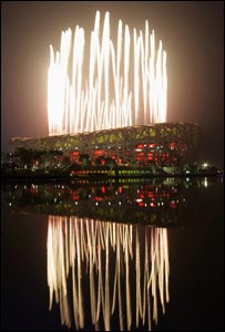आठ अगस्त 2008 की शाम घड़ी की सूई ज्यों हीं आठ बज कर आठ मिनट और आठ सेकेंड पर पहुँची, प्रकाश किरणों की चकाचौंध के बीच ओलंपिक के इतिहास ने बीजिंग आगमन की दस्तक दे दी. एथेंस ओलंपिक में रजत पदक जीतने वाले निशानेबाज़ राज्यवर्धन सिंह राठौर ने तिरंगा लहराते हुए समारोह में भारतीय दल की अगुआई की. खेलों के 29वें महाकुंभ का रंगारंग उदघाटन समारोह विशेष तौर पर बनाए गए बर्ड नेस्ट स्टेडियम में चल रहा है. दुनिया भर के खेल प्रतिनिधियों, कई देशों के राष्ट्राध्यक्षों और लगभग नब्बे हज़ारों दर्शकों की उपस्थिति में चीनी कलाकारों ने अपनी पाँच हज़ार साल पुरानी संस्कृति की मंत्रमुग्ध कर देने वाली झलक पेश की. पिछले दस वर्षों से चली आ रही ओलंपिक की अथक तैयारी का निचोड़ इन समारोहों में स्पष्ट दिखाई दिया. चीन के स्वर्णिम अतीत से आधुनिक युग की ओर क़दमताल में जितने पड़ाव आए उन सबकी झलक दिखाने की कोशिश की गई. बीजिंग के आसमान में शानदार आतिशबाजी के ज़रिए चीन ने मानो ये याद दिलाने की कोशिश की कि बारूद उसी की देन है. यही नहीं चीन की दीवार, छपाई कला, रेशम कारोबार से लेकर उन सबकी झलकियाँ देखने को मिली जो दुनिया को चीन की देन हैं.