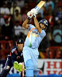 सचिन ने वीरेंदर सहवाग के पारी की शुरुआत की. लेकिन वे ज़्यादा नहीं चले और सिर्फ़ 11 रन बनाकर पवेलियन लौट गए. लेकिन उसके बाद वीरेंदर सहवाग और गौतम गंभीर ने शानदार बल्लेबाज़ी की. भारत का स्कोर जब एक विकेट पर 82 रन था, उस समय बारिश आ गई और मैच रोकना पड़ा. मैच जब दोबारा शुरू हुआ, तो उसे 44 ओवरों का कर दिया गया. लेकिन जब भारत का स्कोर एक विकेट पर 106 रन हुआ, फिर बारिश आ गई और मैच रोकना पड़ा. इस बीच सहवाग ने वनडे में अपना 32वाँ अर्धशतक पूरा किया. लंबे समय बाद जब मैच फिर शुरू हुआ तो ओवरों की संख्या घटाकर 22 कर दी गई. भारतीय बल्लेबाज़ों के सामने तेज़ी से रन बटोरने के अलावा कोई विकल्प नहीं था. इसी कोशिश में सहवाग, गंभीर और कप्तान धोनी आउट हुए. इंग्लैंड की ओर से ग्रैम स्वान ने दो विकेट लिए. जबकि स्टुअर्ट ब्रॉड और समित पटेल को एक-एक विकेट मिला. |