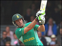 डीविलियर्स के अलावा जैक्स कालिस (48) और कप्तान ग्रेम स्मिथ (38) की पारियों की मदद से दक्षिण अफ्रीका ने पांच विकेट पर 211 रन बनाए जिसके जवाब में स्कॉटलैंड की टीम मात्र 81 रन पर सिमट गई. डीविलियर्स ने 34 गेंद की अपनी पारी में पांच चौके और छह छक्के जड़े. लक्ष्य का पीछा करने उतरी स्कॉटलैंड की शुरुआत काफी ख़राब रही और तीन ओवर के अंदर ही उसने 13 रन के स्कोर पर अपने चार विकेट गंवा दिए और इस खराब शुरुआत से टीम कभी नहीं उबर सकी. स्कॉटलैंड की ओर से कायल कोएट्जर ने सर्वाधिक 42 रन बनाए और माजिद हक ने 15 रन बनाए. इनके अलावा कोई और बल्लेबाज़ दहाईं का आँकड़ा भी पार नहीं कर सका. |