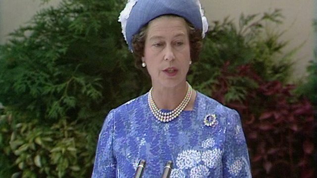 The Queen made a speech in which she looked to the future: "There are hopeful signs of reconciliation and understanding. Policemen and soldiers have told me of the real co-operation they are receiving. I have sensed a common bond and a shared hope for the future."