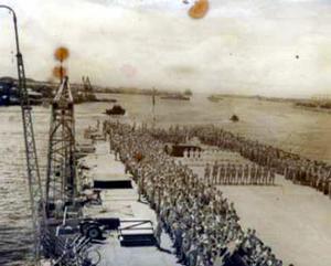 HMS Implacable, aircraft carrier, entering Pearl Harbour October 1945.