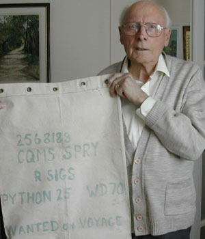 Bill Spry in 2005 with the kit bag he brought home with him from the Far East sixty years before