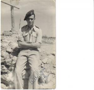 Once the push got in motion we had to pack up and follow. We were on the move quite a bit. One place we got to, I think it was somewhere near Barce, the Italians had left their bomb dump full. I don’t know how many tons there must have been. We started to get rid of it in about 20 ton lots. At one point we had one stack finished and another one nearby almost finished. The first stack was primed ready for exploding. We went up on top of a small hill about one hundred yards away to detonate it. When it was blown a bomb that had lost its base plate was burning on top of the second stack. Our Warrant Officer said, “Don’t worry it will burn for about 20 minutes before it explodes.” No one thought about this stack being much nearer to us than the first one! The burning bomb on the other stack exploded and myself and another fellow went straight under an Italian jeep. The body of the jeep was probably no more than 10 inches high but neither of us touched anything until we landed under it. Apparently a few bomb casings flew over us, but no one was hurt, thank goodness.