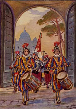 Gordon and I had a happy experience a few days later. We had met one of the Vatican's Swiss Guards, a Sergeant Pfeiffer. He invited us to dine in his Mess... in Vatican City, no less. We were welcomed by a dozen of his mates and, after much good food and wine, were invited to exchange our battle-dress for the Guards' ceremonial uniform. Behold us then - an Englishman and a Scotsman kitted out with baggy trousers, steel breast-plates and Conquistador-style steel helmets. Add two halberds and we were dressed to kill!