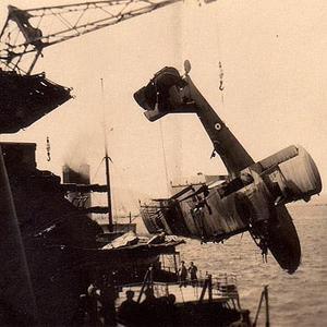 It shows the Kent's Walrus spotter plane being winched aboard. It was shot up in a recce and they lost the pilot petty officer Kemp, and there it is being hauled out.