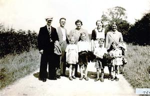 Sunday afternoon walk. Picture taken on Gapsick Lane, Clowne. From left to right, adults are Mr Bend, Mr Beeston, Mrs Wignell, Mrs Beeston, and Mrs Bend. Children are: Hilary Wignell, Ronnie Bend, Ezra and Sylvia Bend.