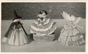 That prestigious shop 'Marshall & Snelgrove' had a beautiful window display of THREE glass Christmas Tree baubles - all too expensive to even contemplate. People made their own Christmas decorations. I made quite a nice sideline of pipe cleaner and paper fairy dolls which went on sale at 'Brown Muff & Co' in a special display. There was a photo in the local paper with the story... Decoration for the table, tree or the mantle piece, hand made crepe paper figures, made by a Bradford woman are selling as fast as she can make them. Between five and six inches high, these expressive little figures, very cleverly angled only cost 2s 3d each. They are prettily coloured and show an ingenious use of material; moreover, they stand without any trouble. The little Spanish dancer in the group pictured is full of movement. Notice the tilt of her head, her lace paper fan and the swirl of her cerise and white frilled skirt. The witch would be fine for a Halloween party. Dressed in green and orange, she has white cotton wool hair which looks most effective against her black hat and cloak and a tinsel ribbon on her stick. The Christmas fairy is very gay in a pale blue dress with silver bodice, a bright silver star on her white hair and pink and white wings dusted with silver..."