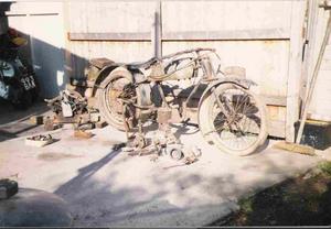 During the years that followed I spent many happy hours in my garden shed rebuilding the complete motorcycle, but I had no saddle, the tank was incorrect being a Rex Acme saddle tank, and should have been a coffin shaped flat tank. On returning to the barn in 1987, and with permission from Osmond's niece, the owner Mrs Janet Whitfield I carefully sorted among the old arable farm relics and came across a bicycle with a sack over it. I lifted the sack and 'Lo and behold'there was the original 1923 saddle. To top this, when I spoke to Janet in the farmhouse she told me she had found a Lucas bulb horn alongside Osmonds bed a few months after his death in hospital.