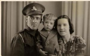 The photograph shows my Grandparents, Bernard and Ellen Hogan with my father. Probably taken early 1940 in Liverpool. my grandfather is dressed in his Royal Artillery Uniform.