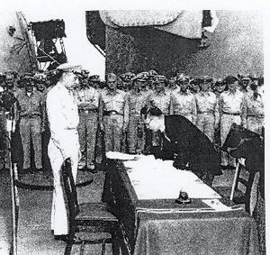 I was on "H.M.S. Ruler", an aircraft carrier, in Tokyo Harbour on 2 September 1945, when the Japanese Admirals arrived on board the "U.S.S. Missouri" to sign the actual surrender with General MacArthur, Chief of Staff of the Allied Forces.