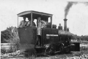 MPQ Advanced Base 1944. 345 Company's Hudswell Hunslett 0-4-0 two foot gauge steam locomotive. It pulled trains of boulders from the Dhansiri River to stone crushers on the Imphal Road. L to R Engine Driver Steam Spr Dhani Ram, Naik Nur Khan, Hav.Clk Ghulam Ahmed Nissar, Capt Alan Shaw RE