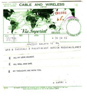 I was naturally anxious to let Betty and my mother and father know that I had got away from Singapore. All telegrams sent during my Far East tour were financed by 3 of us because they were so expensive, Brian Wilson and Jack Spencer sharing with me. My father had arranged to get in touch with their families immediately he heard from me. If the news didn't involve all three of us then it had to be indicated on the telegram. When we inquired about the cost of cables Palembang Post Office we nearly collapsed. It was a few days -- after a pay parade had been arranged before we could afford to do it. As it happened it wasn't very opportunely timed and couldn't have brought much relief to people at home.
