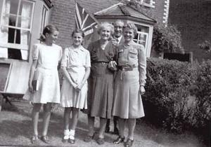 Stella and I had recently become Girl Guides and were at camp near Guildford when rumours started circulating that the Japanese had, at last, surrendered. I returned home to find Uncle Tom and Aunty Hilda up from Plymouth for a holiday. We all went out in to the garden with the Union flag nailed on to a stick and had our photo taken. There weren't any parties: 'what have I got to celebrate?' mother said later.