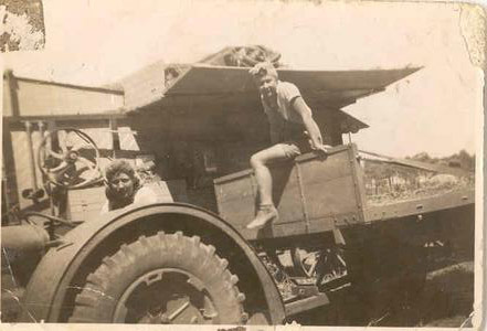 Thrashing the corn at Foxhall Farm in 1943. Kathleen O'Dell (left) and Vera Rookyard (right)