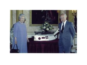 A Picture of the Queen and myself, with the 1 metre long piece of the aircraft, from which I fell. It was presented to me at Buckingham Palace.