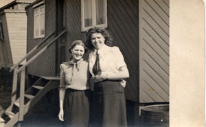 My aunt, Linda Hibberd is on the right (her story can be found at A5135997). She died crossing a level crossing whilst working driving a lorry in the Womens Timbercore in Worksop. My other aunt, Mary, on the left, was a 'clippie' on the Barton buses and lived in the wooden caravan in the background, Manor Farm, Chilwell, Nottingham.
