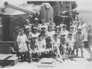 Ships crew and marines H.M.S. Phoebe February 1941 Mediterranean Sea. Greece and Crete evacuation. Kalamata Bay.