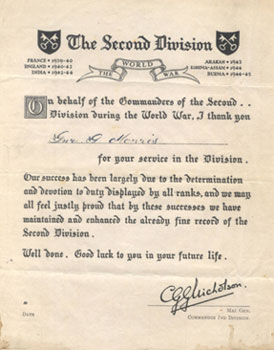 Pre printed “Thank you” from the Commander of the Second Division for efforts during the war! Issued to Geoff Morris 1946.