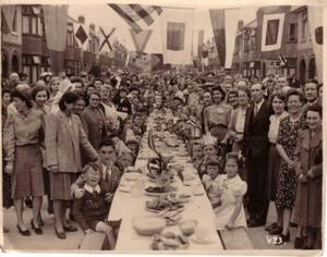 This is a street party on VE day held at Wesley Grove Portsmouth. My parents are in the forground my father to the right wearing his office suit my mother is at the front on the left.