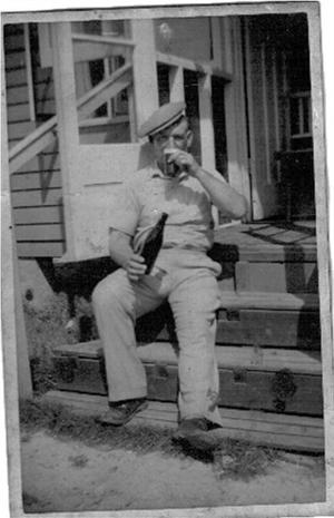 This is my father, enjoying a quart bottle of beer on holiday in Hayling Island in Hampshire,and the pub was only across the road, from where he was staying, so he could always nip across for a refill. He always enjoyed a good glass of beer.