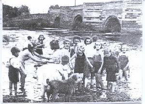 This was a John White's outing to Ditchford during the war. I'm the girl holding her arms out. Ditchford Bridge. A favourite Bank Holiday picnic and bathing place. About 1940/1. Before adjacent industrial development.