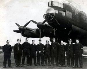 Ronald Derrick, RAF Engineer. Extreme left in front of Lancaster Bomber with bomb doors open.