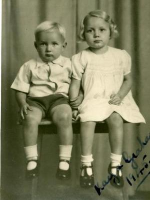 Kay with her younger brother wondering "Who is our Daddy?" during the Second World War. Photo taken 1945.