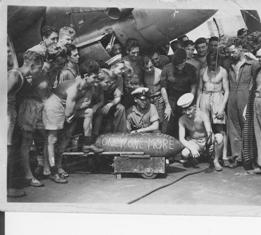 The celebration was, however, somewhat muted and one could sense a certain amount of resentment in relation to the celebrations in London, while as far as we were concerned the war was very far from over. This fact was driven home the following day, when as the photo shows, the Avenger squadron was being "bombed up" for that day's strikes on Japanese airfields, these attacks being designed to stop the flying of Japanese replacement planes to Okinawa where there was an on-going American landing. A few weeks later we were back in the area again, but a bit further north, actually attacking targets on the Japanese "mainland". While we were there the atom bombs were dropped on Hiroshima and Nagasaki. In spite of that,however our planes continued for a day or two with their own bombing raids. Little wonder that the air crews showed a somewhat lukewarm enthusiasm for these raids, when you compare the size of the bombs they were dropping (as in the picture) with the megatons that the A- bomb represented. However, there can be little doubt that the dropping of the A-bombs saved the lives of countless allied servicemen, for I am convinced that the Kamikaze attacks would have increased a thousand-fold once the home islands of Japan were attacked. Who knows? The ultimate deterrent may have done just that and made the prospect of nuclear war so terrible that it is unlikely that anyone will ever contemplate it - no matter how power-crazed they are. Anyway, I guess most of us who were fighting in the far east, were very happy to see the end of the war and the REAL celebration of PEACE that came with VJ day.