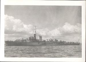 Early in '45 we were ordered to leave the East Indies Fleet and join the British Pacific Fleet, and in company with half a dozen other escorts, we sailed for Australia. First post of call was Darwin, and we stayed a day or two before departing on what was probably my most picturesque cruise of the war, through the Coral Sea and up the coast of Papua to Manus, in the Admiralty Islands, where the Yanks had established a huge base. They threw a reception for us, and there must have been about 5,000 officers at it, squatting under the palm trees at the end of a lagoon, consuming whisky and enormous ham and chicken sandwiches. Our little group had the pleasure of drinking a U.S. Admiral under the table and shipping him, semi-conscious, off in our boat and back to his ship - or at least to some ship! From there we proceeded to Leyte Gulf, in the Philippines, and saw plenty of British ships there bearing the scars of battle damage, notably the aircraft carriers. I knew a flight deck officer aboard the INDOMITABLE, and went aboard to have a close look. At least two suicide planes had crashed on her deck at that time, but she had an armoured deck and so fared much better than some of the Yankee carriers did.