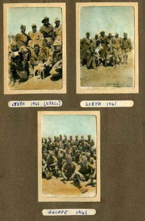 The Libyan desert, 1941. Frank Doe is pictured foreground 2nd right (top left), foreground centre (top right), and foreground 2nd left (bottom). Also posing in the photographs are soldiers wearing Australian uniform and what appears to be Africa Corps uniform.
