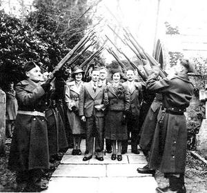 Bert and Gladys Osborne on their Wedding Day outside Osmington Church with a Home Guard of Honour. 22nd December 1940.