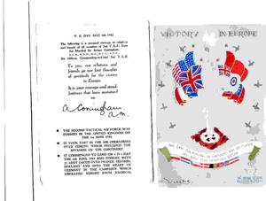 My Dad sent this VE Day Commemoration card to my Mum. His Royal Corps of Signals Unit was attached to 2nd Tactical Air Force/12th Air Formation Signals. Air Marshal Sir Arthur Coningham, the AOC, was a New Zealander. His nickname was 'Maori', which became 'Mary' Coningham to the Royal Air Force.