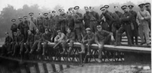 No.1 Y.0.s Class 142 OCTU RE builds Small Box Girder Bridge on Fieldworks training, Aldershot 1939 (author seated fourth from left).