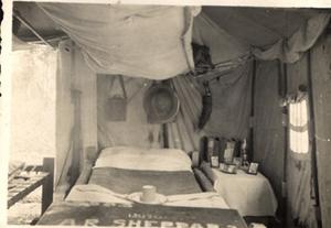 This one of the boys 'CHAPAI' String Bed and Wooden Frame. Cool in the heat but B'#*#Y cold in the winter. Tin Hat is always to hand also water bottle, Note Mosquito net above bed, folded. It looks pretty good on the snap. Assam 1943