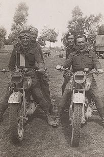 left - Wally Groves with sergeant Jim Cowley on pillion; right - the author with tank driver Jim Bassnet on pillion.
