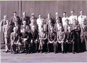 Brooklands Aviation senior management and supervisory staff in late 1945, including Captain Duncan Davies AFC, Chairman, centre front, and on his right-hand side Bill Williams Chief Engineer and on his left-hand side the writer's brother Bob Eaves, who had become Deputy Chief Engineer