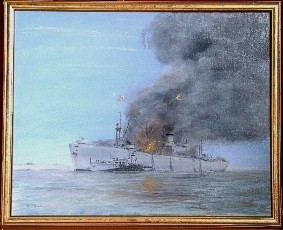 Fox Troop of 318 Battery having gone on separately to land on D-Day the rest of the Regiment and transport embarked on 3rd June at London Docks and were due to land on D+1 to reinforce them in defending Pegasus Bridge from air attacks.Overnighting off Southend our convoy set sail on 6th June.The escorting vessel ordered our captain to lower the barrage balloon to avoid detection from Calais but were passing Dover at midday when a loud explosion forward of the bridge from two 15 inch shells fired from Calais set the ship and deadly cargo on fire.Attempts made to put the fire out were of no avail and we set about putting ammunition overboard to lessen more the damaging explosions already occuring.I was at the aft end of the ship and one of our number was severely wounded in the back from shrapnel.He was unable to walk and when the order came to abandon ship we lowered him over the side by rope but did not think he had much chance of survival.He did survive and some years later he spproached me in the street.If Billy Oakes is reading this he'll remember it well!We left the ship down ropes and were eventually picked up after trying to climb aboard one of the naval escort ships but had become too weak in the cold water to do so.Apparently 83 people did board and they were taken on to the beaches and returned three days later.We were landed at Dover and taken to Dover Castle and kitted out in a variety of sized uniforms.The Regiment eventually arrived at Aldershot,was re fitted and we met up with Fox troop at last on 29th June. Recent information found on the Internet showed there were 150 casuallties from all units on board.