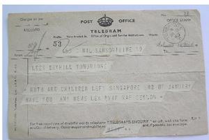 Monday 29th December 1941 - Telegram from Mother in Singapore received in Tonbridge to say her and family were all well in Singapore.