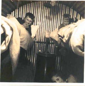 One young man who was disabled and worked in the Bank with my father had been bombed out 7 times. His family would always go out in the garden when there was a raid, it felt safer to them. Some people dug air raid shelters in the garden, but after the landmine we had a corrugated iron shelter called an Anderson put in our front room. It was like an up-side-down U and it was packed around with sandbags, and the windows in the room had yellow sticky mesh put on them, and there were orange and apple boxes filled with sand and stacked against the outside of the walls. There were four bunks, one on top of the other on each side of the Anderson where we children slept, and our parents slept on the floor below. I remember it as being quite a big shelter, but I have seen one over from the war recently and it's really very small. I can't think how we all managed to squash into it.