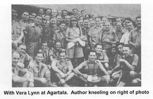 It was probably about April or May 1944 that we had a visit from the force's sweetheart, Vera Lynn. We were then stationed at Agartala, not far from the Burma border. This visit was very important. She spent the whole day in the camp, having a midday meal with us in the dining room. We had photographs taken with her afterwards and in the evening she sang the old songs we loved. The two favourites were "We'll meet Again" and "The White Cliffs of Dover". It was a great morale boost and as well as that many of us hadn't seen a white woman in months. I was lucky enough to see and hear her again. She was giving a concert for the Army when we were on one of our journeys to the North West Frontier Peshawar -but there were hundreds at the concert there and the personal touch was lost. At Agartala the visit was for our squadron alone -probably less than one hundred men.