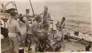 We called at Esquimault, a small Canadian Base; at Hawaii, free from tourism on Waikiki beach, and still with memories of the attack on Pearl Harbour; at Guam, where we were not allowed outside the naval base because there were still Japanese soldiers lurking in the jungle; and finally we reached Singapore. I had carried out my sea duties, and also edited a light-hearted ship's newspaper suggested by someone to improve the "atmosphere". We had celebrated passing the Equator with a rough ceremony conducted by King Neptune and his minions, in a large canvas bath. As one "crossing the line" for the first time, and watching the treatment meted out to some, I was calculating how long I could hold my breath under water, but I was whisked out, and to the other side, in double quick time. Perhaps good humour was beginning to assert itself.