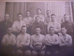 The strangest thing I found out was that a football match was arranged in Belgium, I think a town called Halle or something similar near Brussels.Where my grandad played against a local factory called BAFA or BATA. The photo shows the team.Some of the names I know are : Lt Fleming (Scotland) Corporal Bill Stone (London)Arthur Veale , Albert De`Fury (Bradford), Tomkinson, Robinson (Newcastle) and O`Halloran (Irish).The game was played just before he went into Holland where he describes the parachutes of all colours hanging from the trees.I don`t know the name of the rest of the team.Im afraid the look in his eyes tells me he`s `remembering the men and not just the names, and whatever memories he`s recalling I know I shouldn`t ask.