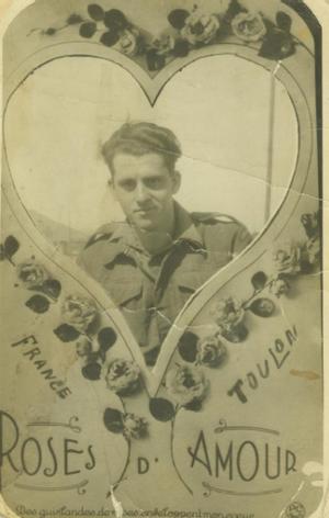 In the winter of 1947 I was given leave. I was sent home by what was called the MEDLOC route, on a US Liberty ship via Port Said to Toulon in Vichy France, where we stayed in a transit camp for three days during which we were forbidden to have any contact with the locals because the Vichy regime had collaborated with the enemy. It must have been someone in the camp who made the postcard containing my photo in a rose-wreathed heart, which I sent to my mother. We then travelled across France by train. It was bitterly cold. I’ve never been so cold in my life. The train stopped at Lyon or Dijon, where German prisoners served us food. They were better off than we were. They had tins laid out in which they were collecting foreign coins, and were selling cigarette cases made from old mess tins — beautiful filigree work.