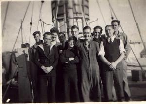 Len Thacker, fourth from right, with Thruster shipmates, 1944.